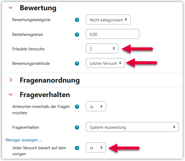 Bei einer erneuten Öffnung des Versuchs für einzelne Personen müssen dann nach der gespeicherten Nutzeränderung in den Einstellungen des Tests noch bei der "Bewertungsmethode" die Option "Letzer Versuch" gesetzt werden und unter "Frageverhalten" - "Jeder Versuch basiert auf dem vorigen" auf "Ja" gesetzt werden.
