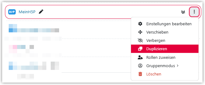 Wenn Sie das verlinkte H5P-Element duplizieren möchten, z. B. um es als Grundlage für einen abweichenden Inhalt zu nutzen, müssen Sie das Element im Inhaltsspeicher duplizieren und bearbeiten und dann über die Aktivität H5P an der gewünschten Stelle im Kurs hinzufügen.