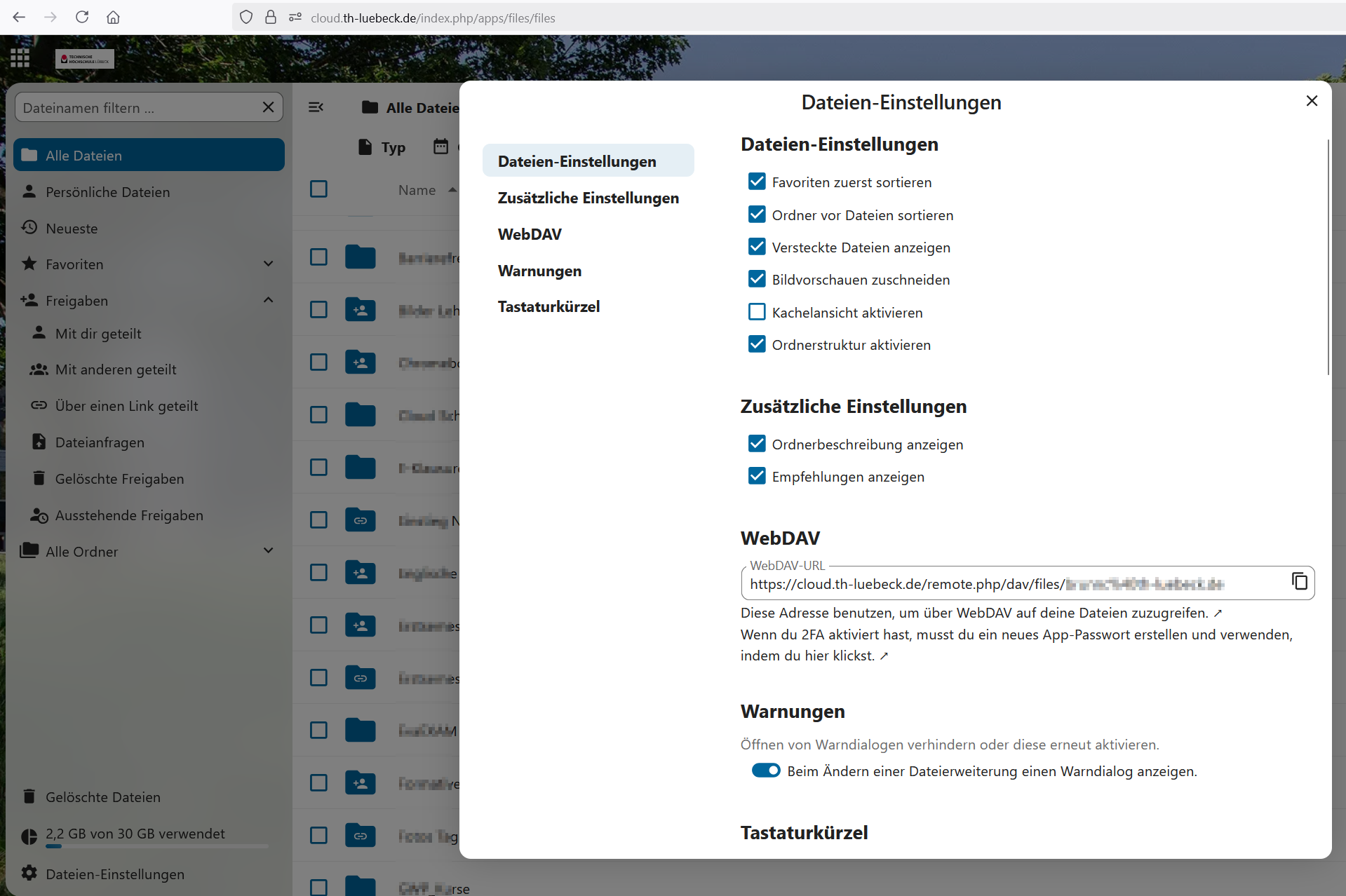- Serveradresse der Nextcloud eintragen (aus cloud.th-luebeck.de → Dateien → Dateien-Einstellungen)