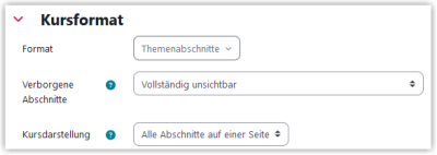 Auf Wunsch können Sie auch ein Kursbild hochladen. Das Kursbild wird unter "Meine Kurse" für den jeweiligen Kurs angezeigt. Zusätzlich wird das Kursbild auch auf der Kursseite im oberen Bereich direkt unter dem Titel dargestellt. In jeder Darstellung und je nach Bildschirmgröße wird ein anderer Ausschnitt des Kursbildes angezeigt. Generell wird jedoch immer ein Ausschnitt aus der Bildmitte dargestellt und oberhalb und unterhalb abgeschnitten. Ohne Kursbild wird unter "Meine Kurse" automatisch eine farbige "Kachel" für den Kurs angezeigt.