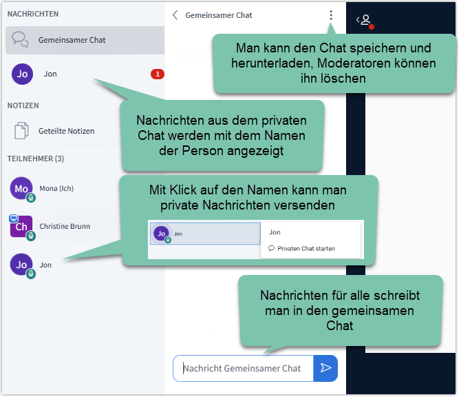 In BigBlueBotton ist ein öffentlicher Chat integriert. Der private Chat wird über die Teilnehmerliste genutzt.
